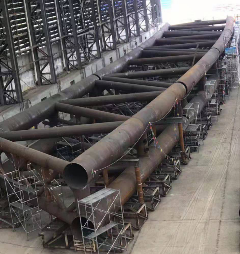 ? 犍為岷江特大橋是公司繼商合杭淮河特大橋、恩施找龍壩特大橋之后承建的又一座特大跨度鋼管混凝土拱橋,主跨457.6米,鋼結(jié)構(gòu)用工程量12000余噸。項目自開工以來公司精心組織,克服了工期緊、任務(wù)重及焊接質(zhì)量要求高等困難,在成熟的施工經(jīng)驗基礎(chǔ)上不斷改進細(xì)節(jié)、提升設(shè)備能力、優(yōu)化資源配置、完善工藝方案,先后攻克了Q390D-Z25厚鋼板焊接、相貫線焊縫焊接及修磨、拱肋節(jié)段臥式拼裝工藝控制等技術(shù)難題,優(yōu)質(zhì)高效的完成了主拱肋首輪節(jié)段制造和試拼裝施工,為鋼管拱按期合龍奠定了堅實的基礎(chǔ)。
