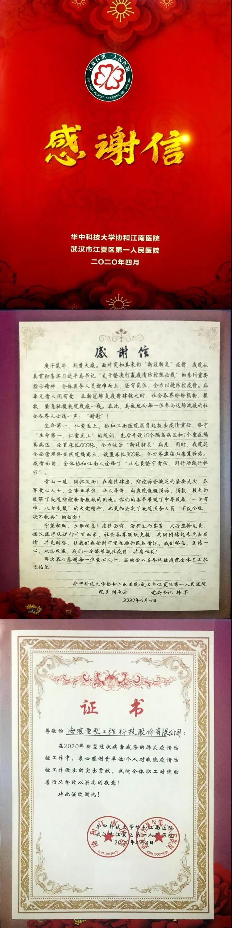 為疫情防控出力,海波重科義不容辭!收到感謝信,海波重科更是心懷感恩!雖然當前武漢抗疫工作已取得了決定性的勝利,海波重科在積極復工復產的同時將以最嚴格的措施堅決阻斷疫情向公司蔓延的渠道,全力守護好全體員工的生命安全和身體健康。