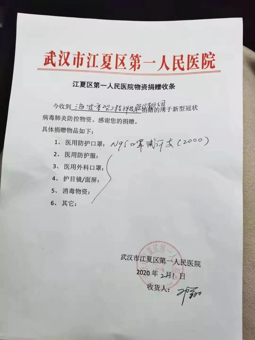 全國一盤棋,勠力齊戰“疫”。為支援新型冠狀病毒肺炎疫情防控工作,2020年02月01日,海波重型工程科技股份有限公司向武漢市江夏區、武漢市經濟技術開發區(漢南區)相關部門共計捐贈現金及物資210000元,其中N95口罩2000只,定向捐贈給武漢市江夏區第一人民醫院,為抗擊新型冠狀病毒肺炎疫情貢獻綿薄之力。